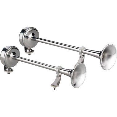 Avertisseur électromagnétique, double, avec cornet, étrier de fixation et membrane en acier inox.